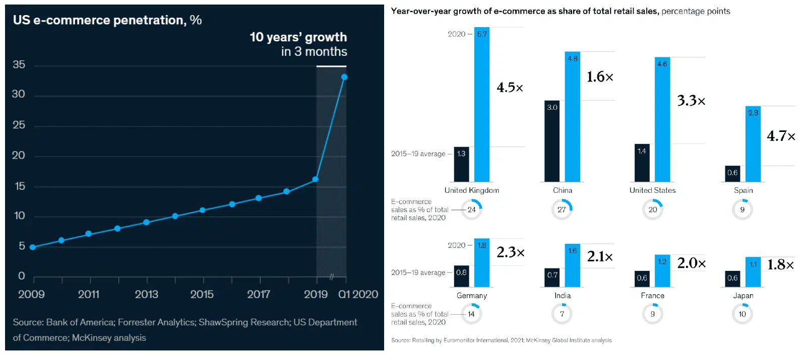 Sie fragen sich vielleicht, warum eine Pandemie einen Anstieg der Verpackungsnachfrage verursachen sollte? Das lag nicht an der Pandemie selbst, sondern an den Auswirkungen, die sie auf uns alle als Verbraucher hatte. Da wir wegen der verordneten Schließungen zu Hause bleiben mussten, verließen wir uns auf den elektronischen Handel und die Lieferdienste, um den Großteil unseres Bedarfs zu decken. Die E-Commerce-Landschaft selbst passte sich ebenfalls an und schuf eine Verschmelzung von Online- und Offline-Erfahrungen wie BOPIS (Buy Online Pick-up In-Store), Abholung am Straßenrand und Lieferung am selben Tag. Plötzlich waren Artikel, die nie eine Sekundärverpackung mit zusätzlichem Transportschutz benötigten, auf diese Materialien angewiesen.