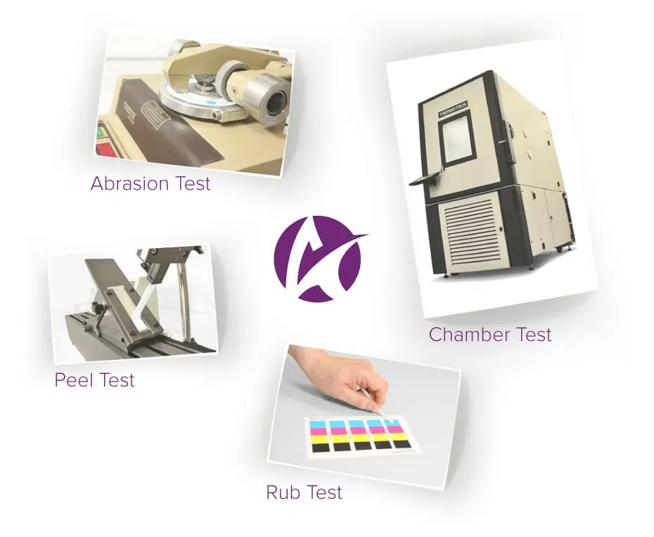 Ne cherchez pas plus loin que GetLabels. Chez GetLabels, nous testons chaque papier, étiquette synthétique, film, tag, encre et toner dans notre laboratoire de recherche sur les matériaux pour mesurer la force d’adhésion et la résistance à l’humidité, aux solvants chimiques, à l’abrasion et à la lumière UV, comme indiqué ci-dessus, afin de garantir que nous livrons un produit final de haute qualité. En suivant les procédures de qualité documentées par les normes ISO, nos ingénieurs d’assurance qualité suivent nos produits de la matière première à leur état fini.